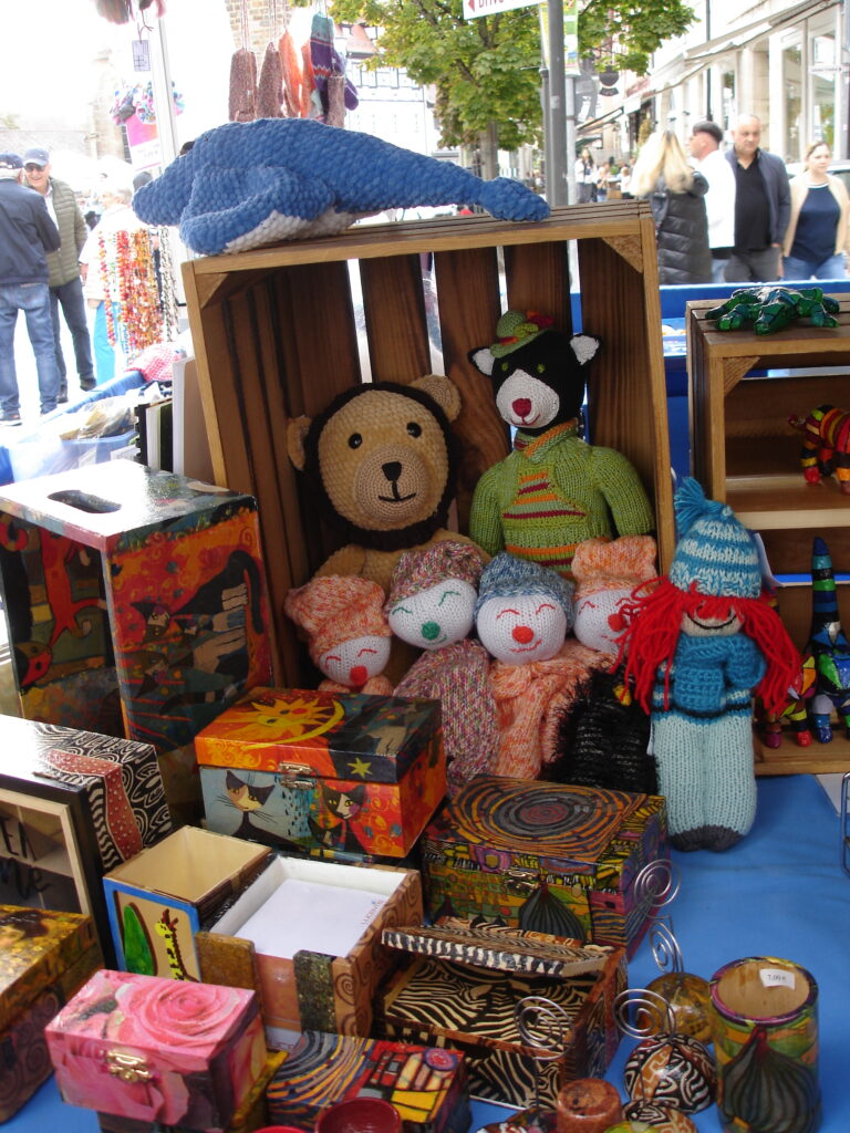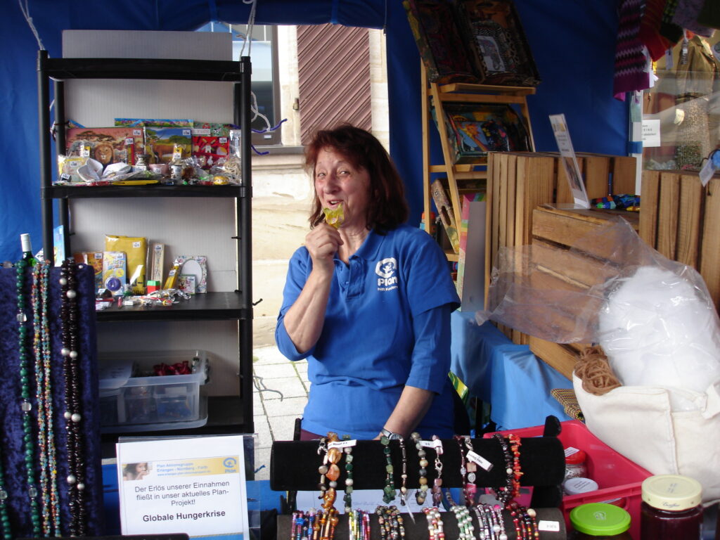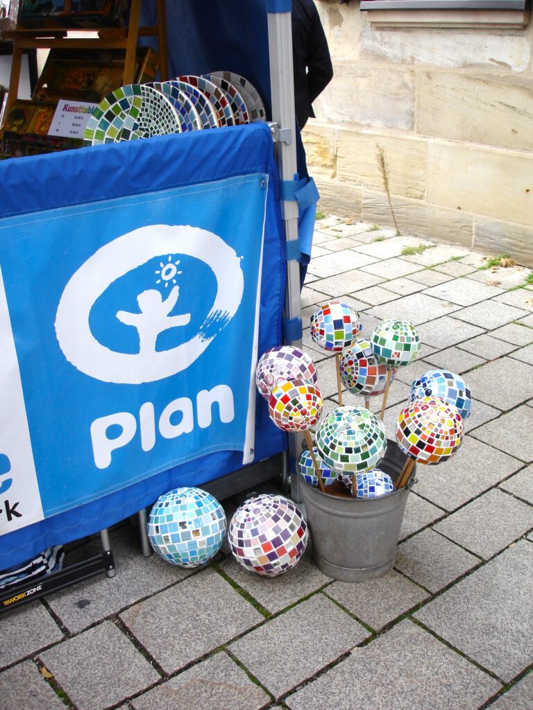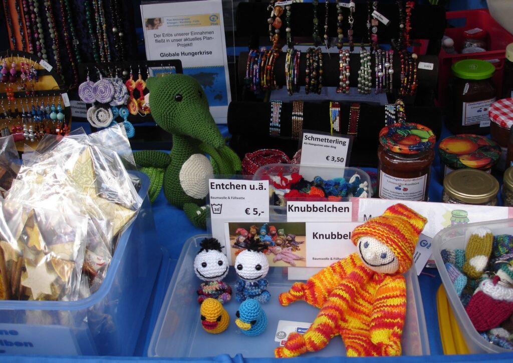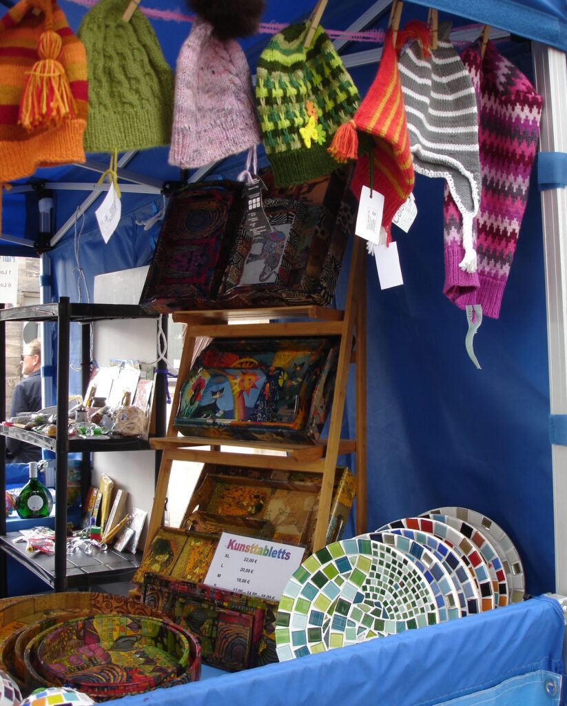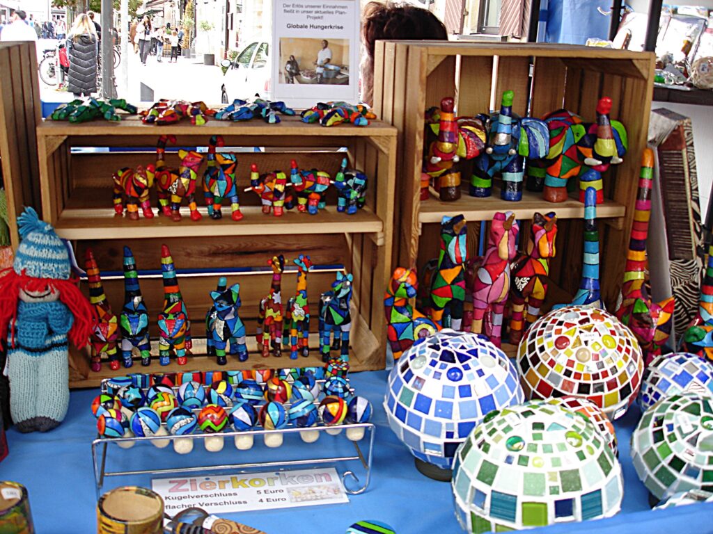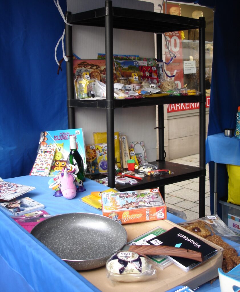 Unsere bunten Werke fanden etliche Abnehmer und auch unsere Lose gingen gut, so dass wir auch hier wieder trocken und zufrieden einpacken konnten. Das Geld geht auch hier natürlich wieder an das Plan-Projekt zur „Globalen Hungerkrise“.