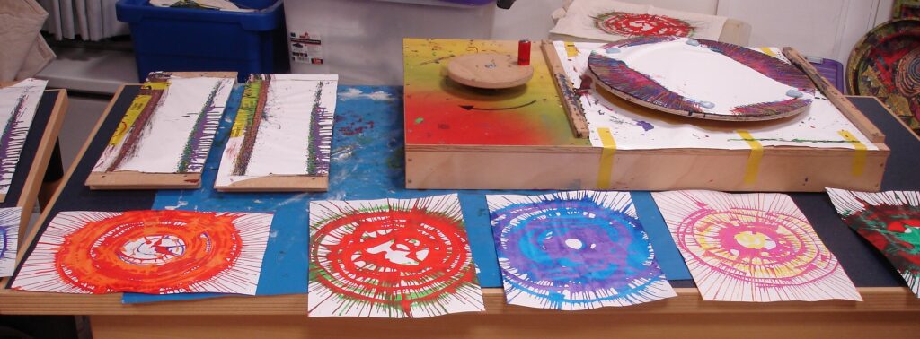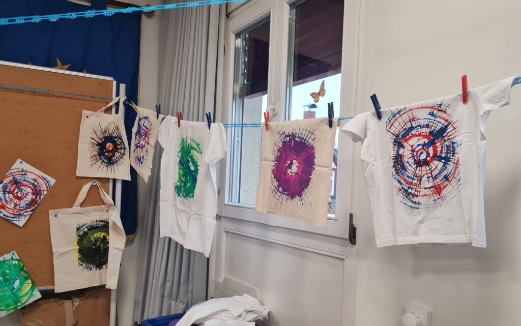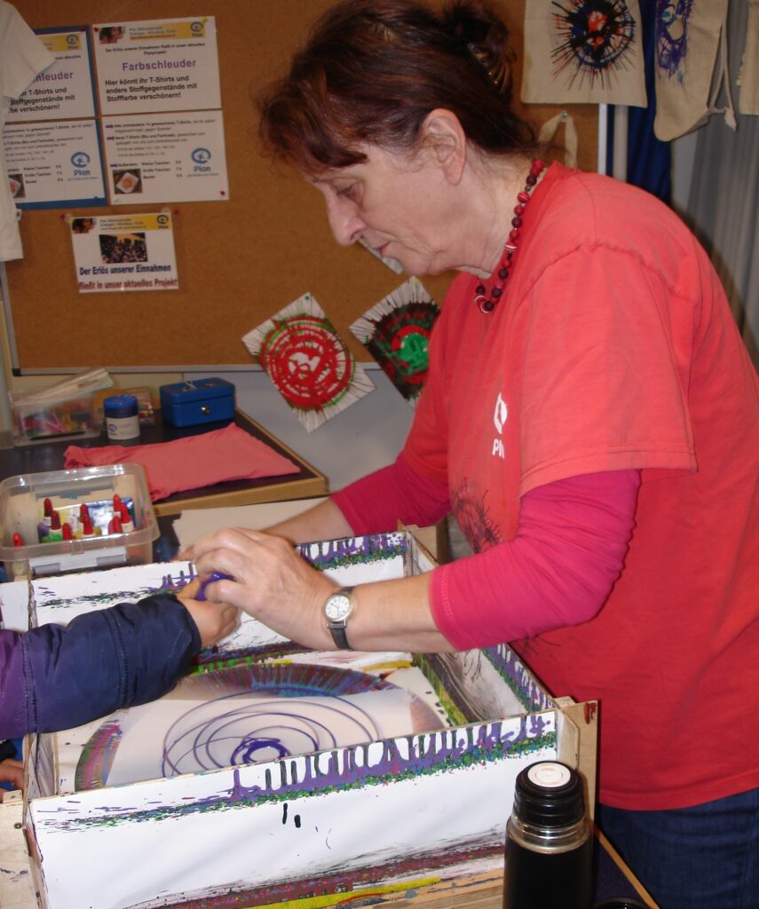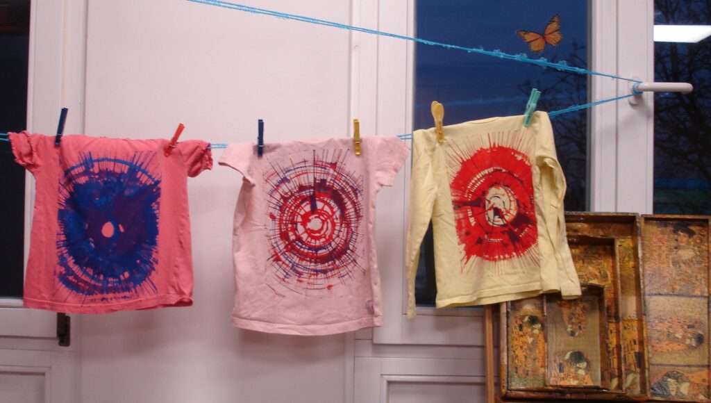 Das das Wetter nicht nur grau war, sondern auch immer wieder Regen brachte, waren wir sehr froh, drinnen, und damit im Warmen und Trockenen stehen zu dürfen. Dort konnten wir nicht nur unsere bunten Werke richtig schön ausbreiten, sondern wir konnten auch unsere Farbschleuder in Betrieb nehmen. Mit ihr wurden dann auch einige neue oder mitgebrachte, teilweise fleckige T-Shirts, Stofftaschen und -beutel mit hübschen Schleuderbildern versehen.